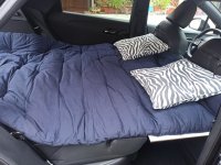 You probably saw how I organised it. Leave the rear headrests and the parcel shelf at home. Push the passenger seat right forward to fit a large Ikea storage box behind it, which contains a lot of gear like bottles of water and the kettle and the airbed pump and the collapsable bucket and crockery - even a tablecloth and dish towels. With the addition of a cape or a shawl on top, it provides just the right support for the head end of the airbed. However, it stops anyone sitting in the front passenger seat unless it's moved while driving (possible, I just didn't need to).
